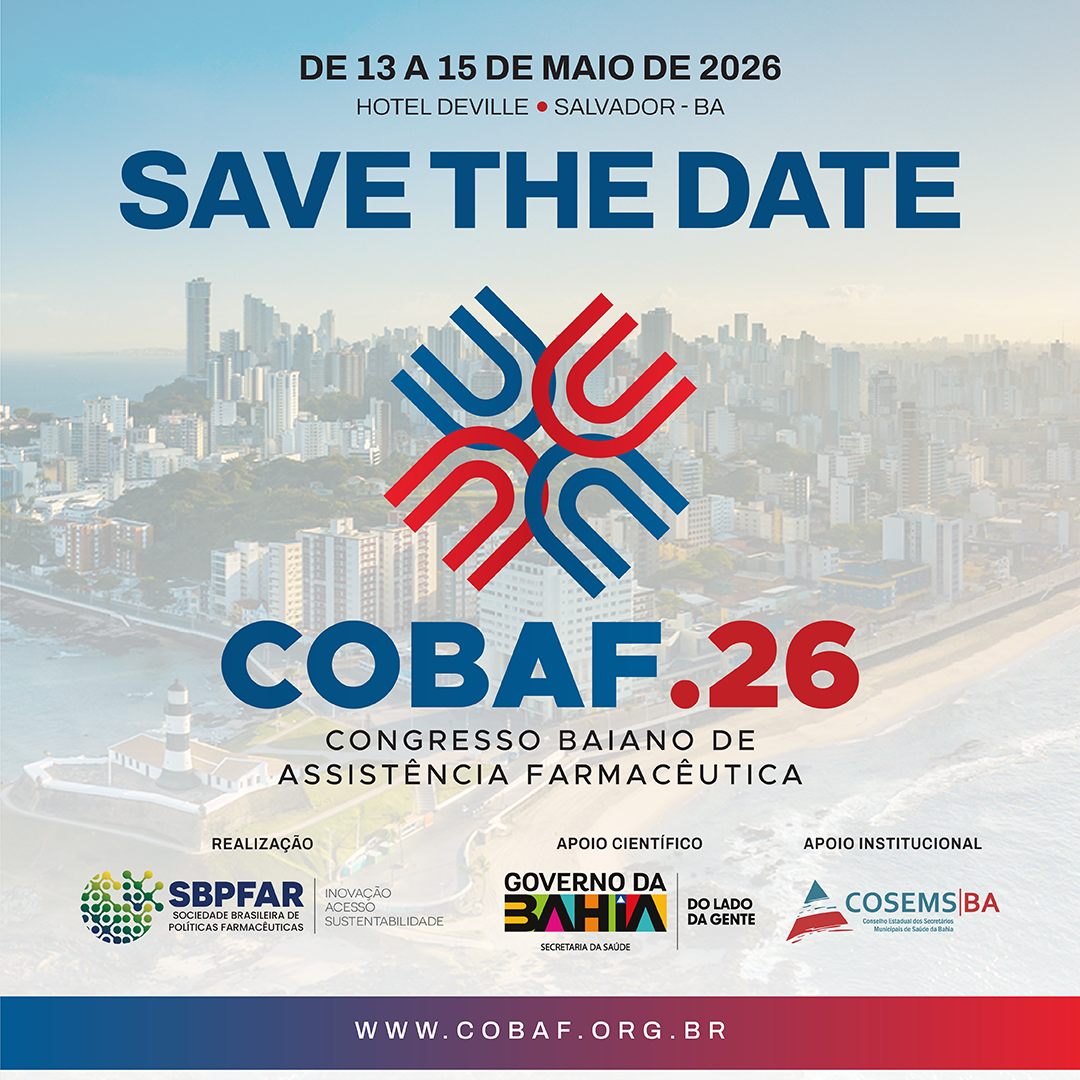 a Sociedade Brasileira de Políticas Farmacêuticas (SBPFAR), com apoio científico da Superintendência de Assistência Farmacêutica, Ciência e Tecnologia (SAFTEC), promoverá, entre os dias 28 e 30 de maio de 2025, na cidade de Salvador – Bahia, o II Congresso Baiano de Assistência Farmacêutica (COBAF.25). Com o tema central “Assistência Farmacêutica em Transformação: Integração, Equidade e Inovação para um Futuro Sustentável”, o COBAF.25 propõe um espaço ampliado de diálogo, articulação e construção coletiva entre gestores, pesquisadores e profissionais farmacêuticos atuantes na Assistência Farmacêutica do SUS Bahia. O evento tem como objetivo central debater estratégias e articulações necessárias ao fortalecimento da Assistência Farmacêutica no SUS.